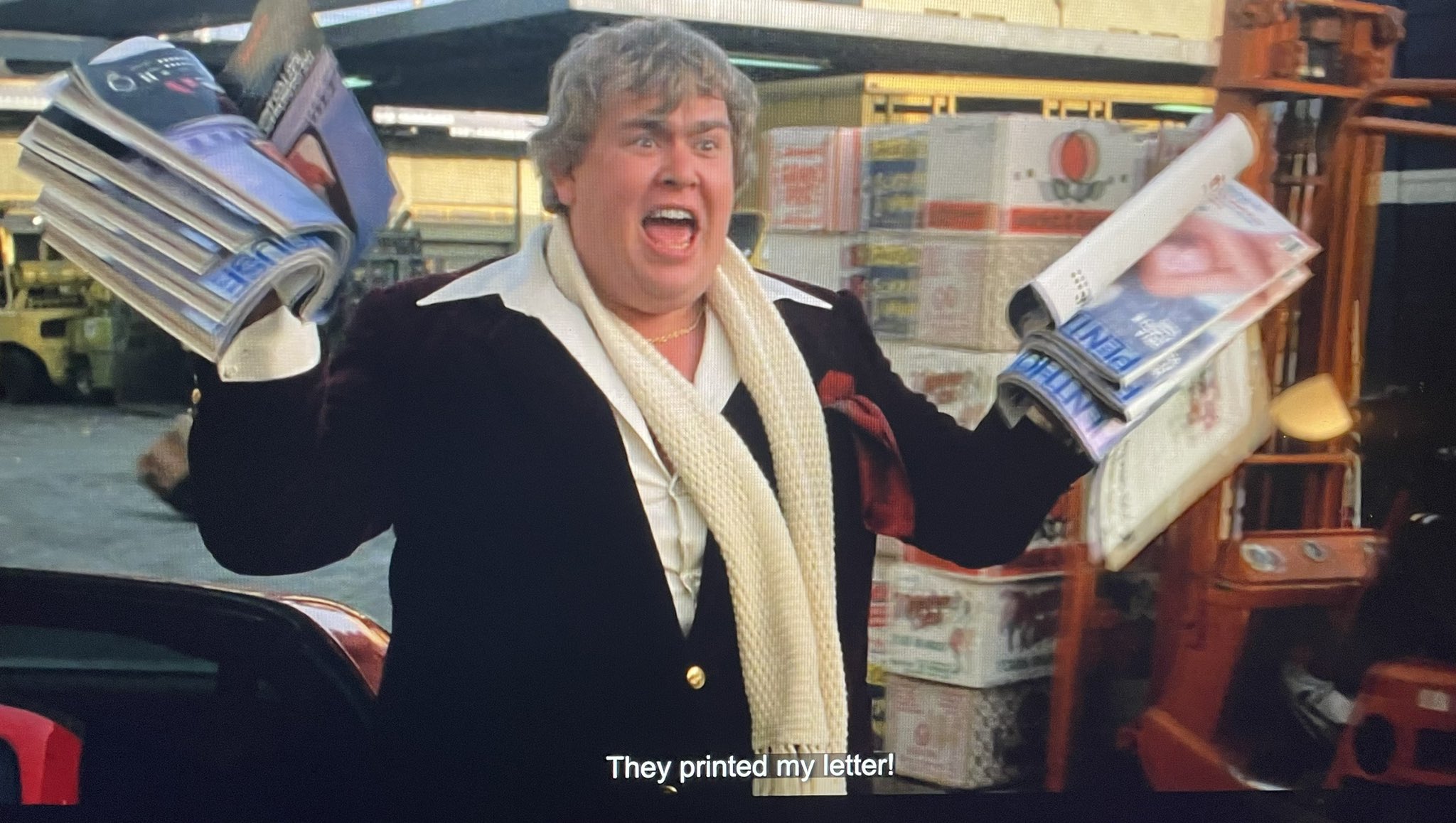 A: … which I hadn't seen since I was a child. Too small to have seen it. Don't remember anything about it. The one thing that I remembered in that movie from being a kid and not knowing what Penthouse letters were, was John Candy talking about how he's, he finally got his Penthouse letter printed, and it was…