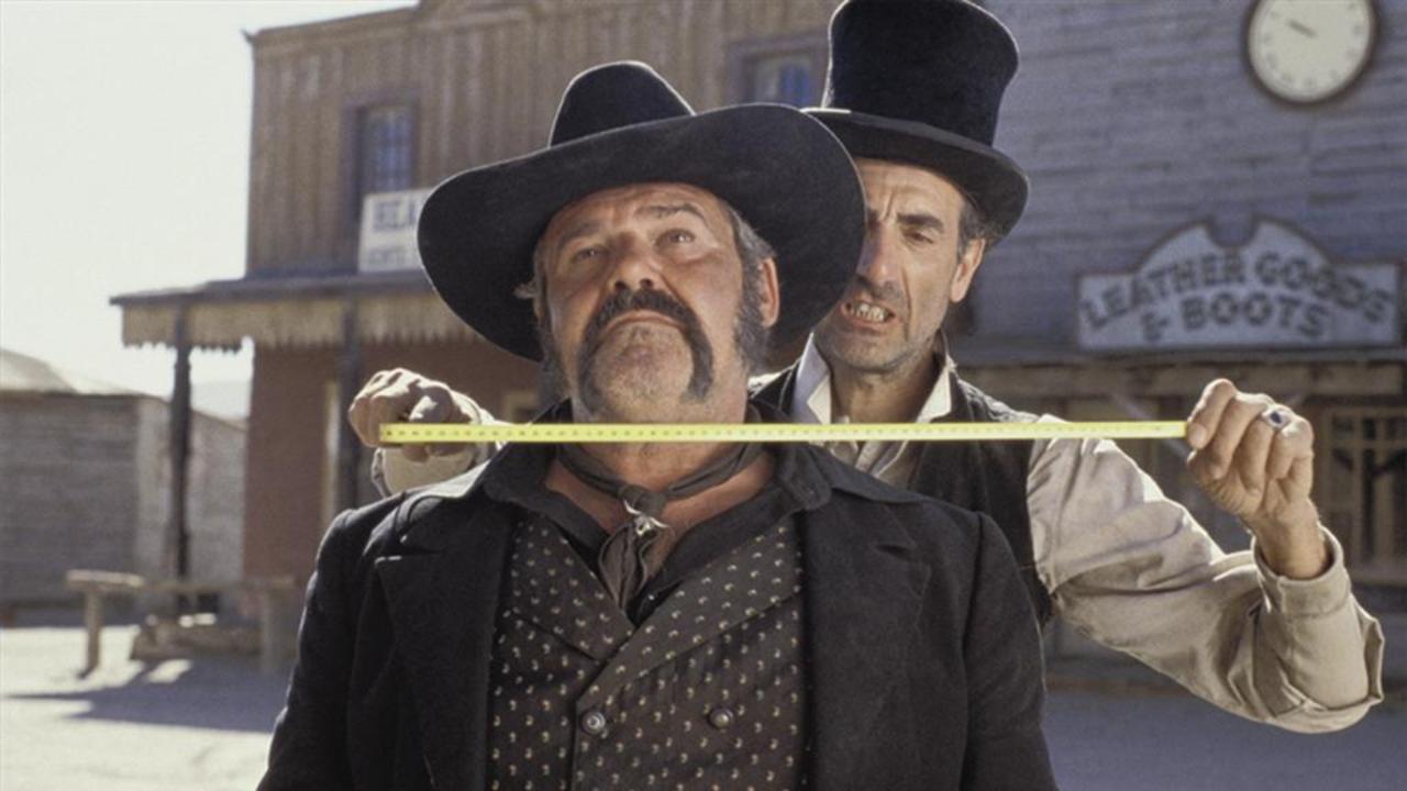 D: It's got… I… when I first heard the description of this movie, that it is set in Spain, in one of the towns that was built for Spaghetti Westerns where they shot a bunch of these movies… and not the big ones, not The Good The Bad and The Ugly. They shot the little stuff, the stuff that you don't remember anymore. I love the fake titles that they used in the movie. There's one of them that made me laugh really hard. What was it? It was Two Rifles and A Grave. I thought it was fantastic, and then I'll Go Kill Him And Come Back. Perfect. It sounds poorly translated.